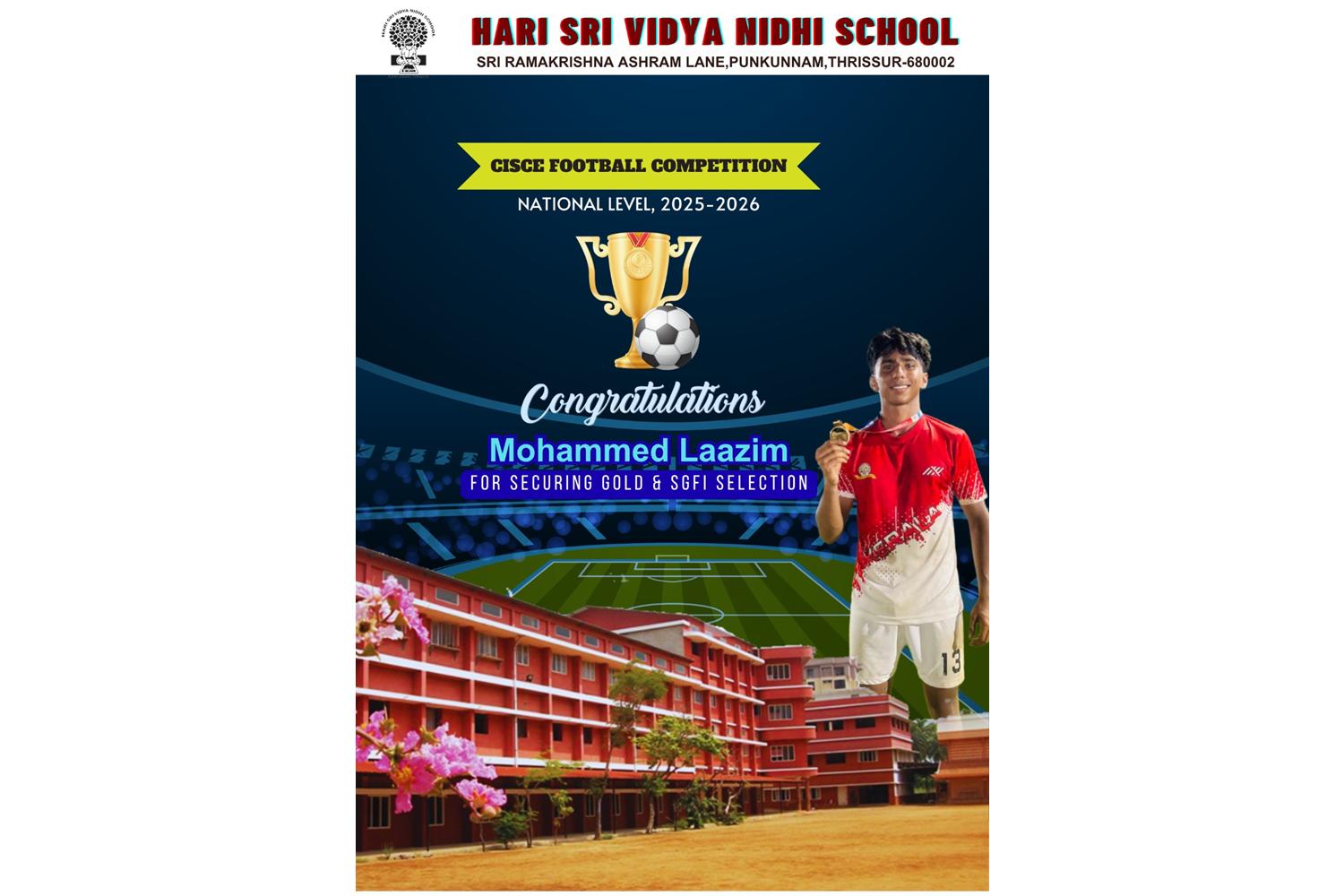 Hari Sri Vidya Nidhi School is bursting with pride as student Mohammed Laazim achieves a spectacular double victory at the CISCE Football Competition, National Level 2025-26.