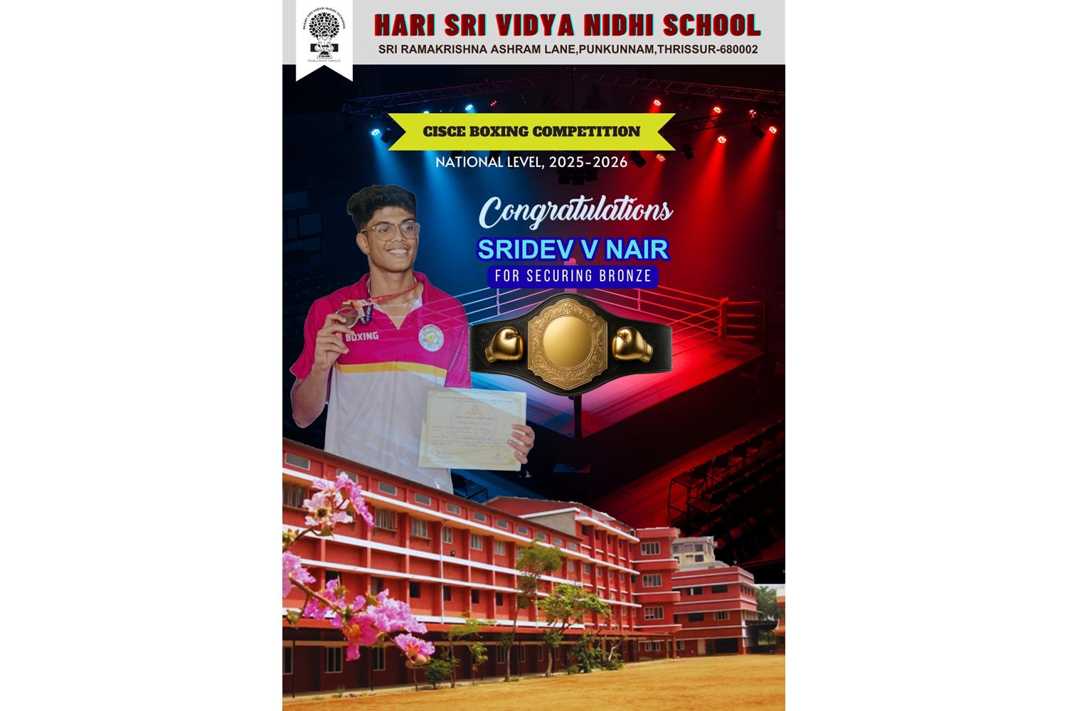 Hari Sri Vidya Nidhi School proudly announces the exceptional performance of Sridev V Nair at the CISCE Boxing Competition, National Level 2025-26.